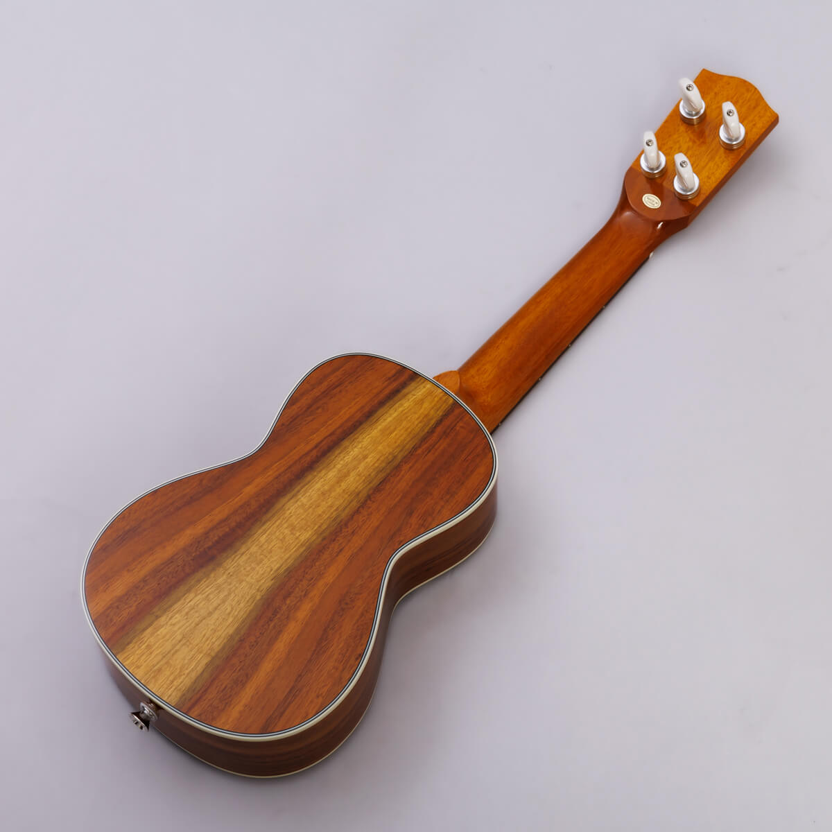 ハワイアンコアに近い性質を持つブラックウッドを使用した、オール単板ボディ。美しい木目と、ウクレレらしい明瞭なエッジの効いたサウンドが特徴です。ボディに施されたバインディングやサウンドホールのロゼッタが、高級感を演出しています。