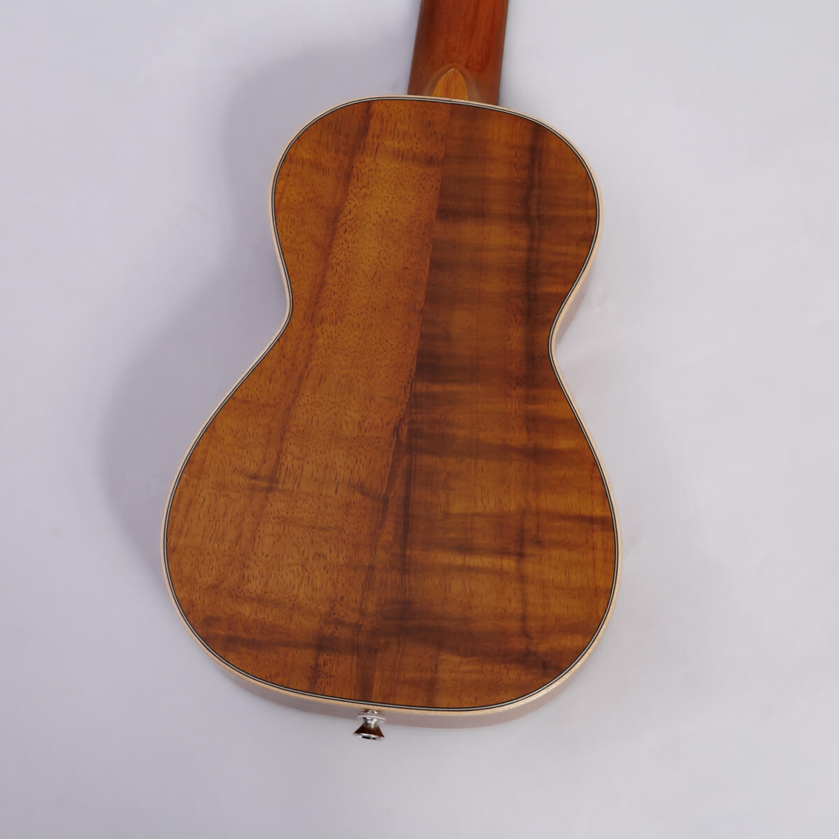 美しい木目と、ハリのある明るく陽気なウクレレらしいサウンドが魅力のハワイアンコア単板を、ボディ全体に贅沢に使用したオール単板仕様です。ボディに施されたバインディングやサウンドホールのロゼッタが、高級感を演出しています。