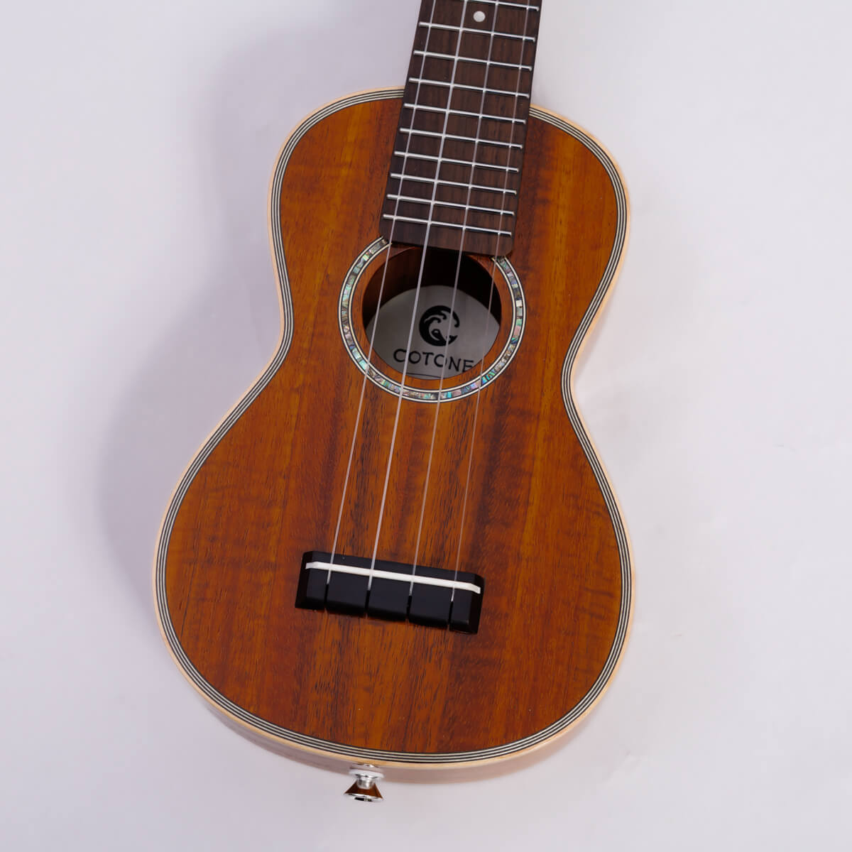 美しい木目と、ハリのある明るく陽気なウクレレらしいサウンドが魅力のハワイアンコア単板を、ボディ全体に贅沢に使用したオール単板仕様です。ボディに施されたバインディングやサウンドホールのロゼッタが、高級感を演出しています。