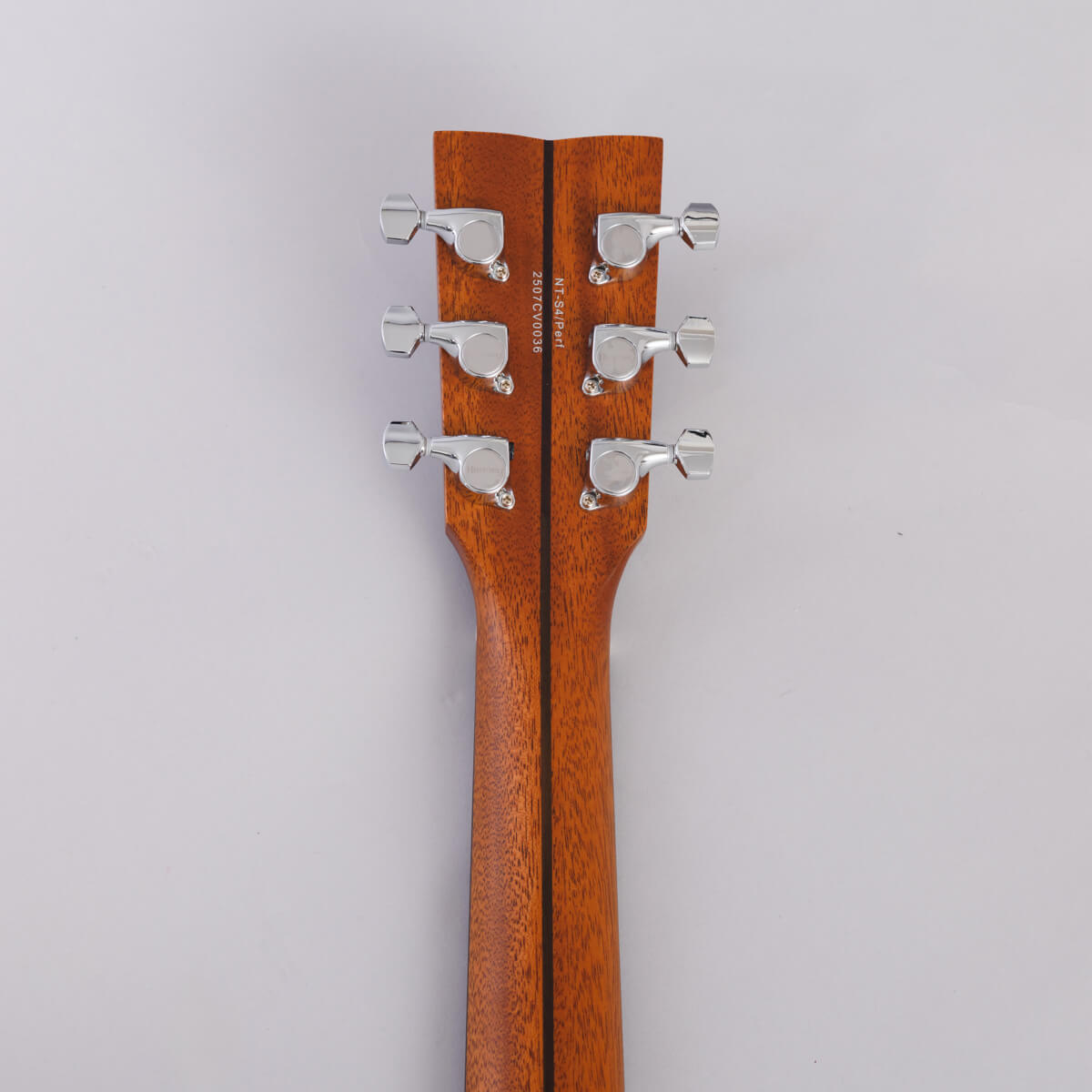 ボディトップにはスプルース、サイド&バックにはアフリカン・マホガニーを採用したオール単板仕様により、ウォームで深みのあるトーンと優れたレスポンスを実現。エルボーカットのコンター加工により、抱えやすく長時間の演奏でもストレスを軽減します。